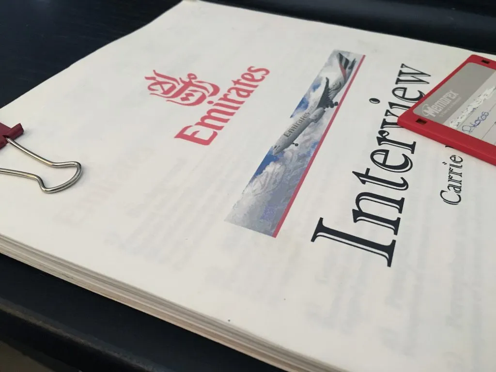 I wasn’t wearing that awful blue scarf this time. No. I’d upgraded my delusion. I’d dressed like I already worked there alright. I’d done it all, all the way down to the cream parchment resume with red headings. I was one sewing needle away from embroidering an Emirates cartouche onto my interview lapel.